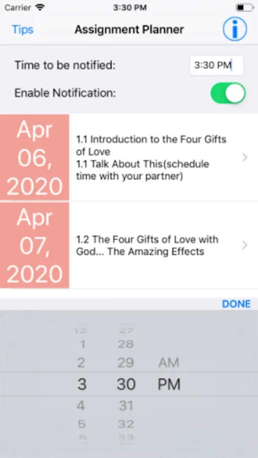 The Four Gifts of Love® Class Assignment Planner was created to help you schedule and keep track of assignment completion for either the online or group format. This mobile app will help you not only schedule your assignments, but it also allows for notification to remind you about a scheduled assignment.