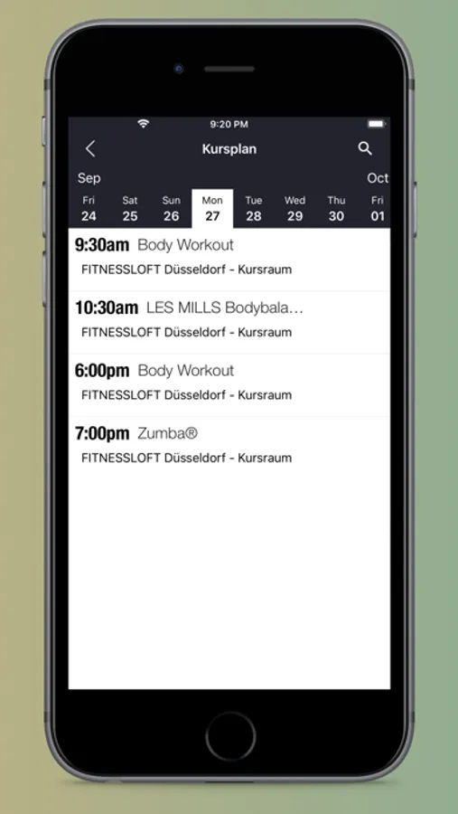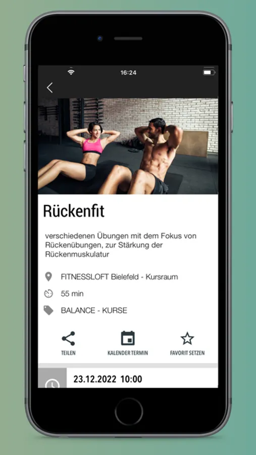 Direkter und aktueller Zugriff auf den Kursplan von überall: Für Deine Lieblingskurse kannst Du Details wie Zeit, Kursbeschreibung, Raum und Merkmale wie z.B. den Schwierigkeitsgrad einsehen. Du erhältst schnellen Zugriff auf Deine Lieblingskurse über "FAVORITEN". Und das Beste: der Kursplan ist immer aktuell!