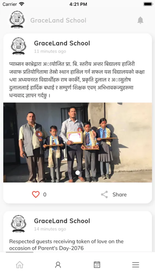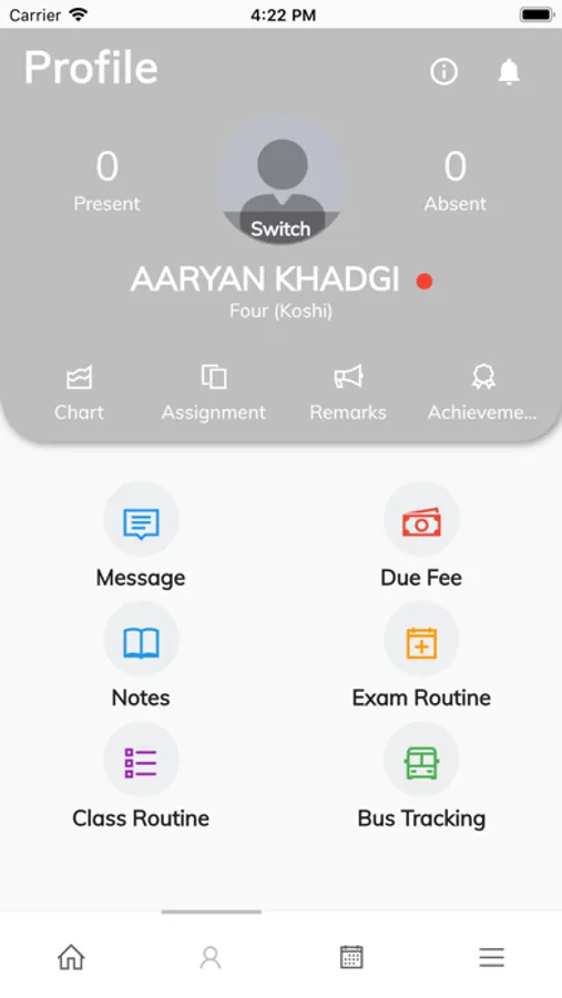 The parent can view all the information of their child i.e. remarks from teachers, assignments, fee information, school notice, class routines and exam routines, calendar and events, and real time chat with the school staffs. Parents will receive notifications for any update on their child, i.e "the student is present today" notification after teacher takes the attendance.