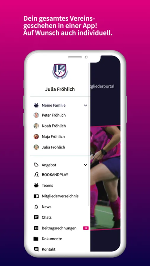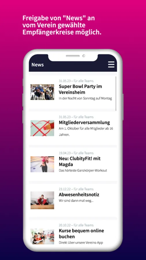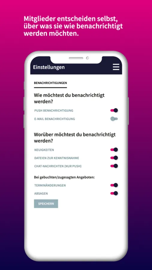 - Benachrichtigungs-Optionen: Du bestimmst, über welche Inhalte Du wie (per Push-Nachricht oder E-Mail) Du von Deinem Verein benachrichtigt werden möchtest.