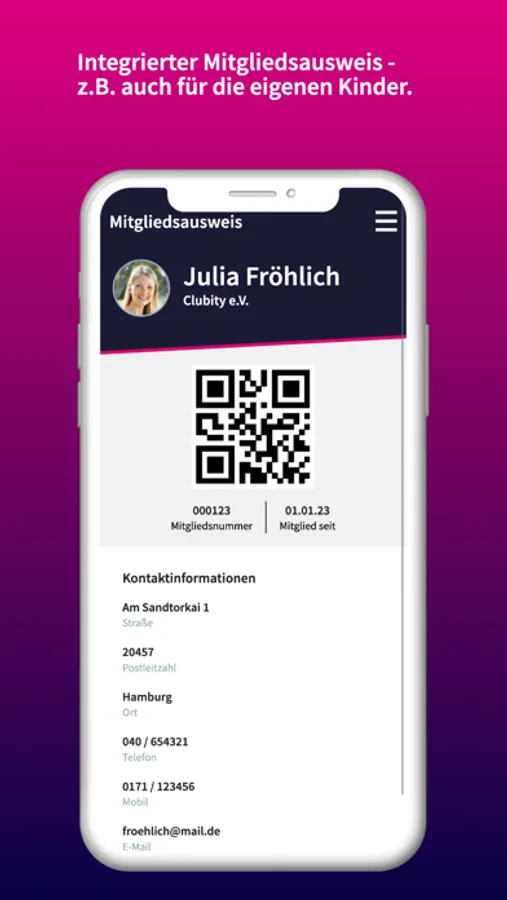 Mit der neusten Version der CLUBITY Mitglieder-App hast Du an einem Ort stets alle relevanten Vereinsinformationen- und Kontakte zur Hand. Ändere Deine Kontaktdaten mit nur wenigen Klicks, verwalte auf Wunsch auch die Daten Deiner Kinder oder nutze den integrierten Mitgliedsausweis zum komfortablen Check-In in den Sportstätten Deines Vereins.