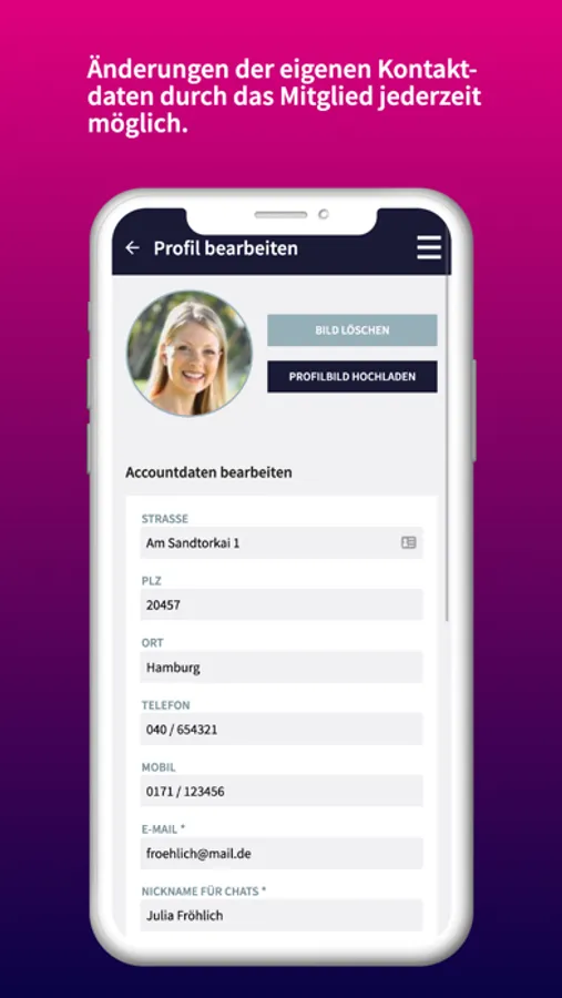 - Selbstverwaltung von Stammdaten: Ändere Deine eigenen Kontaktdaten oder die von Deinen Kindern jederzeit selbst oder lade ein eigenes Profilfoto hoch.