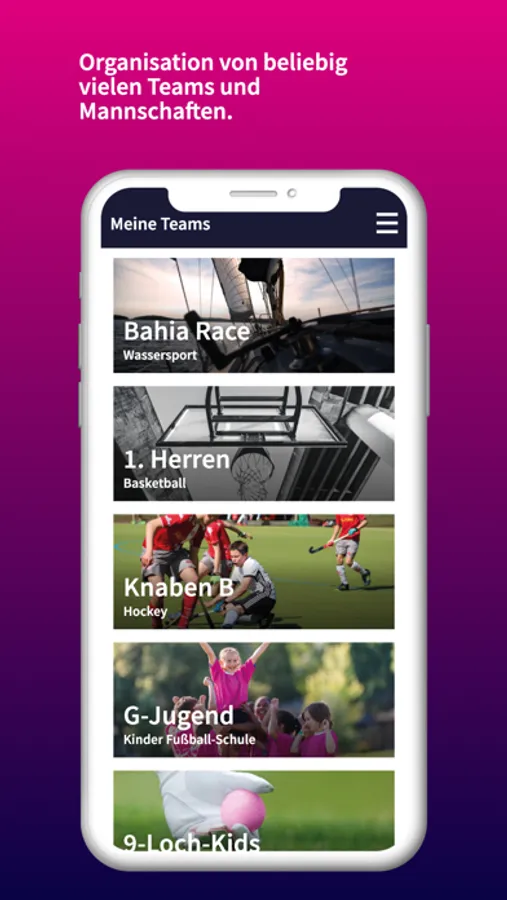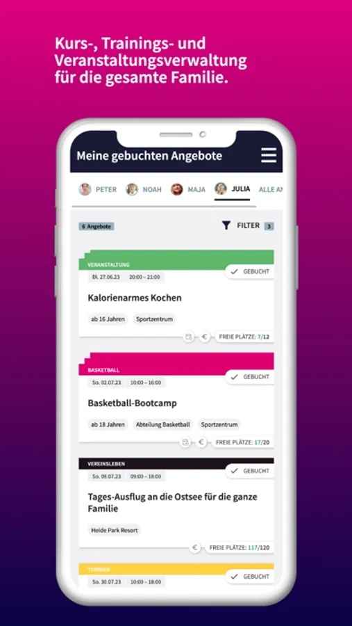 - Alle Trainings, Kurse und Turniere im Blick: Mit der neuen Kurs- und Buchungsübersicht kannst Du auf das gesamte für Dich oder Deine Kinder relevante Angebot Deines Vereins zugreifen, einzelne Plätze oder Kurse buchen, die Teilnahme an Trainings zu- oder absagen und wirst live über etwaige Verschiebungen von Terminen oder Austragungsorten informiert.