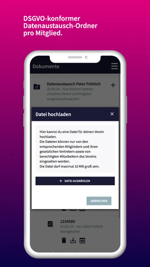 - Upload von Dokumenten: Fotografiere wichtige Dokumente, wie z.B. Ermäßigungsbescheide oder Bescheinigungen und sende diese einfach und datenschutzkonform über die App an Deine Mitgliederverwaltung.