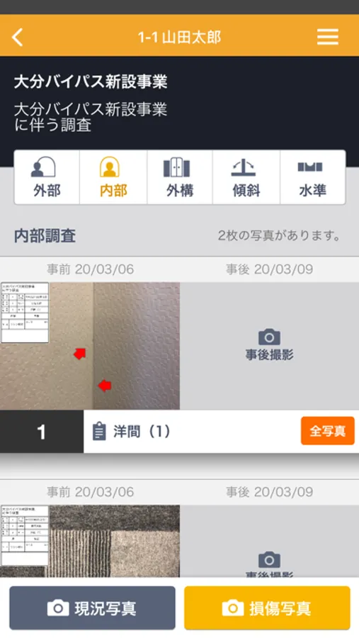 別々に撮影しなくても自動で整理されるので場所(部屋)ごとに現況写真と損傷写真を同時に撮影しても問題ありません