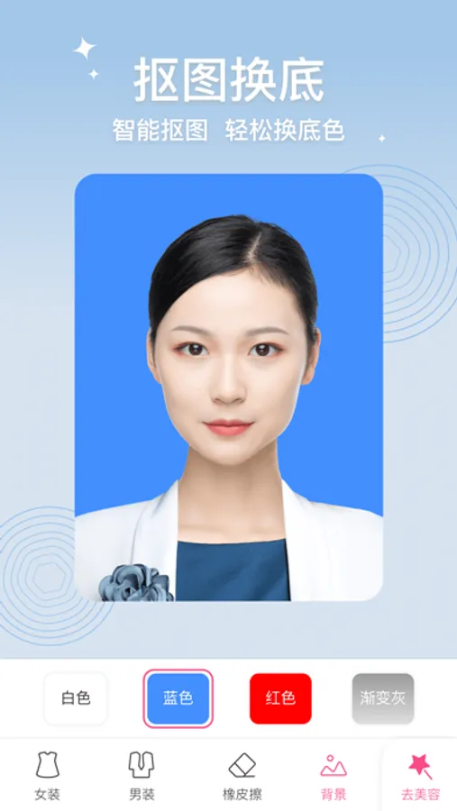 高清证件照是一款专业的智能证件照相机,支持人像自动扣图修图,美颜美白,证件照底色更换,尺寸选择,一键换装生成最美证件照