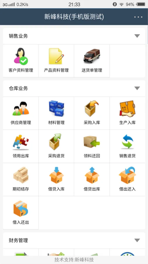 新峰软件包括,BOM组装功能,销售订单,采购订单,入库,出库,送货,库存, 财务,进销存报表等功能。