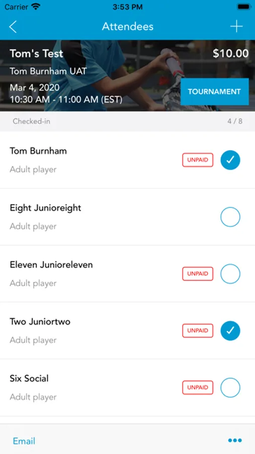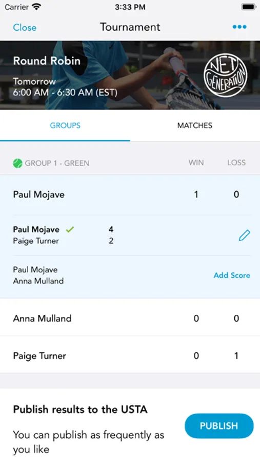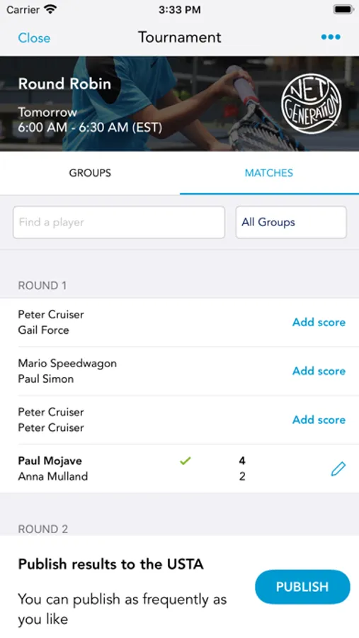 The app provides an on-court player check-in and an outstanding Round Robin event management tool that allows you to check-in players, automatically group players based on age and ball color, move players within groups, modify score formats, share score cards and publish results.