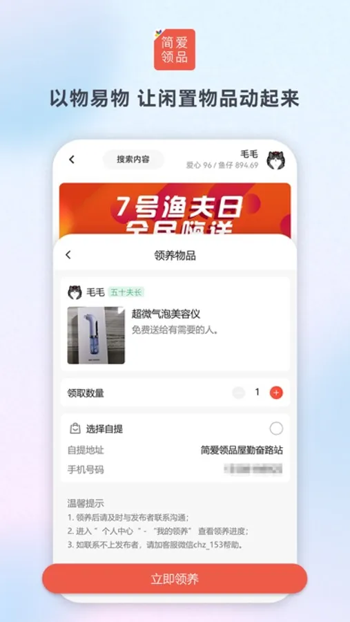 简爱领品——由爱心人士发起的以物易物公益平台,本着“赠人玫瑰,手有余香”的理念,把手中闲置的物品送给有需要的人,促进“多的没有余,少的不会缺”,落实“共同富裕”的国策。