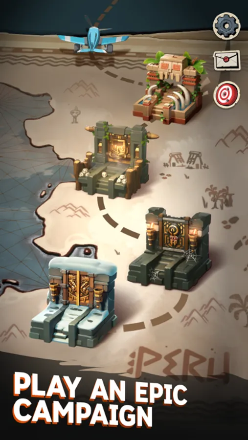 Travel through the golden arch-shaped doors of the treacherous underground tombs, across hazardous mountain caves, flourishing jungles and lush waterfalls.