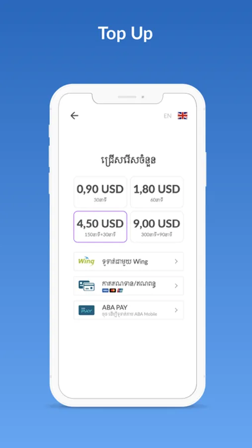 - Top up your account with as little as $0.90 using Wing, ABA or Visa/Mastercard