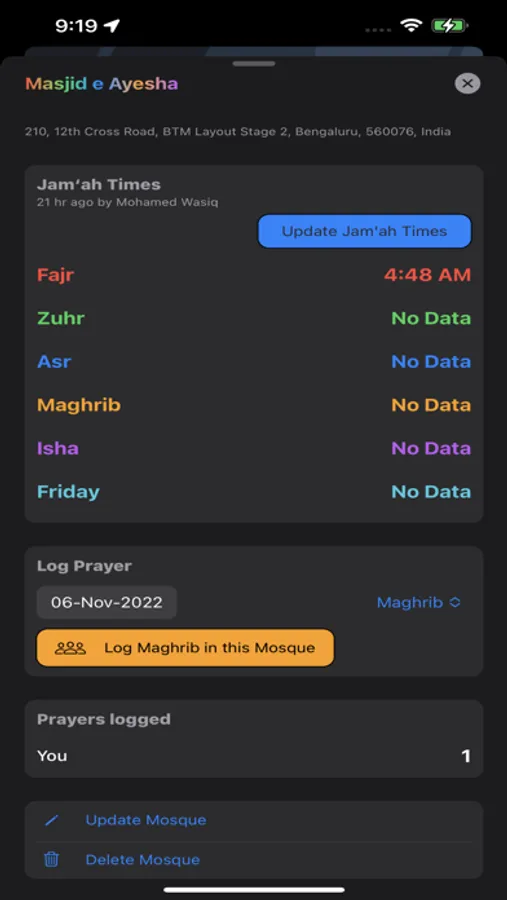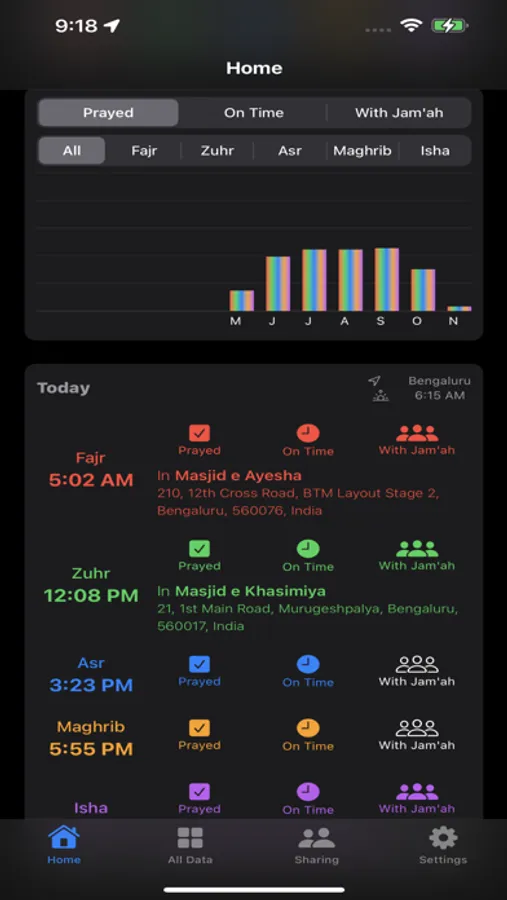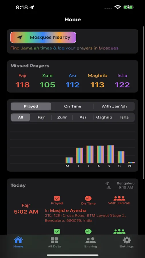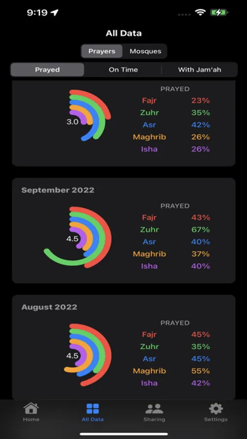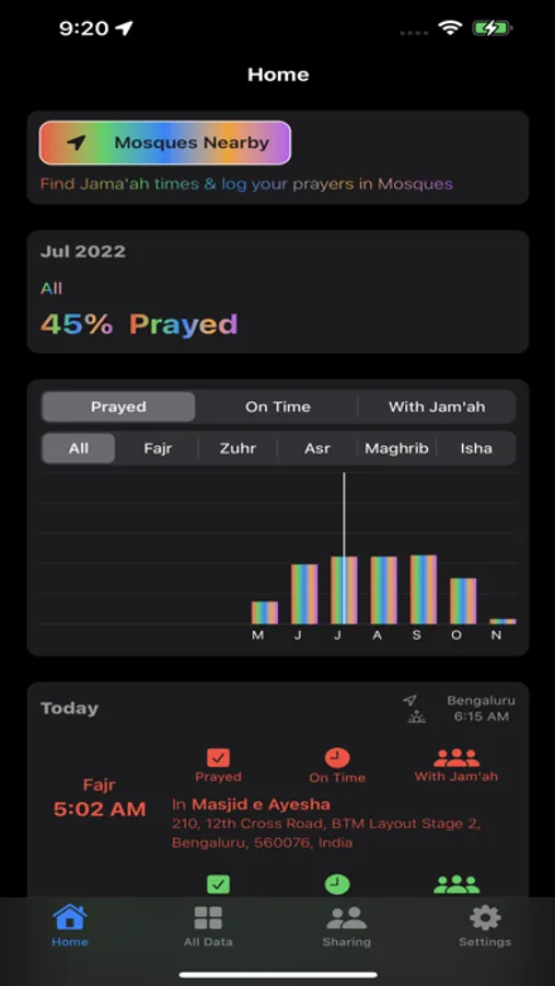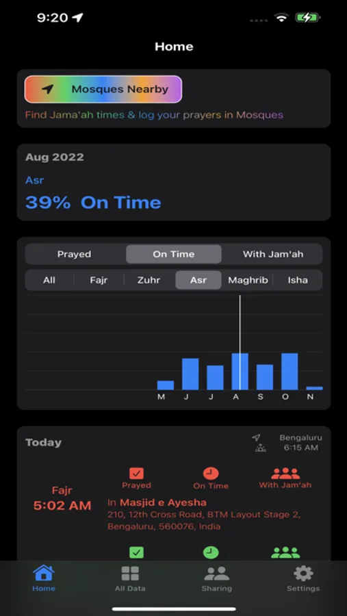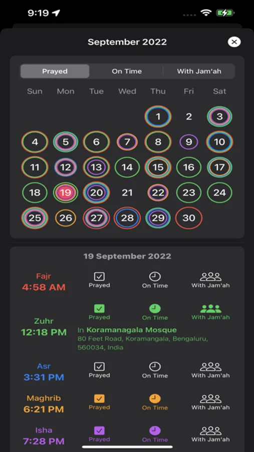 Track & log your prayers Prayed, On Time, In Congregation and with Mosques