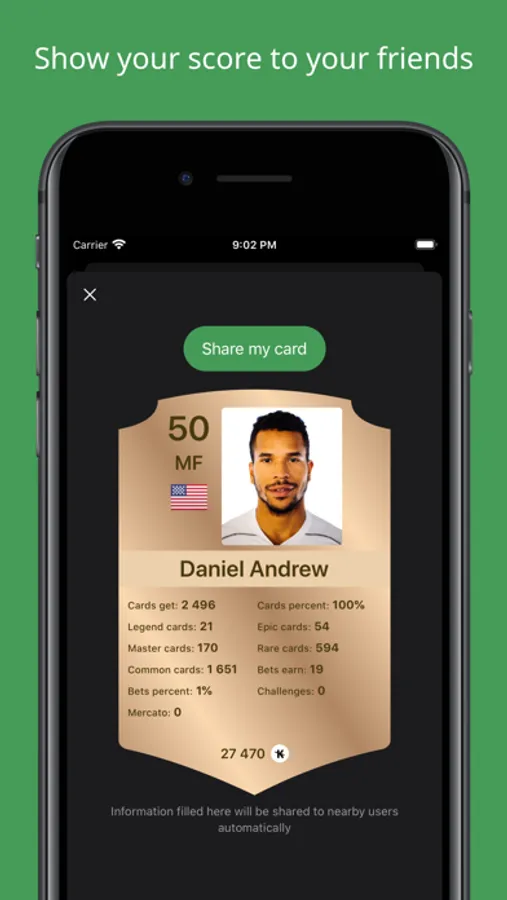 Increase your score on your profile card by successfully completing the challenges, winning your bets and collecting more and more cards.