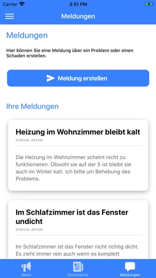 - Einfach und zeitsparend können Sie per Knopfdruck eine Meldung/ Störung zu Ihrer Wohnung melden. Somit können Sie sich entspannt zurücklehnen und die Hausverwaltung meldet sich im Handumdrehen mit einer Lösung bei Ihnen.