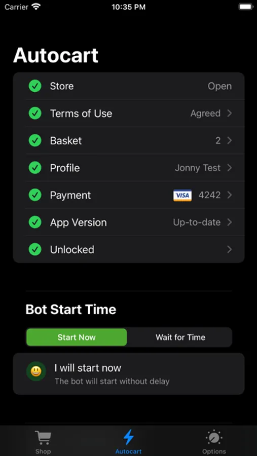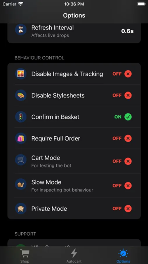 • Stop on out-of-stock (either terminate the bot if an item is out of stock or keep going with the order anyway)