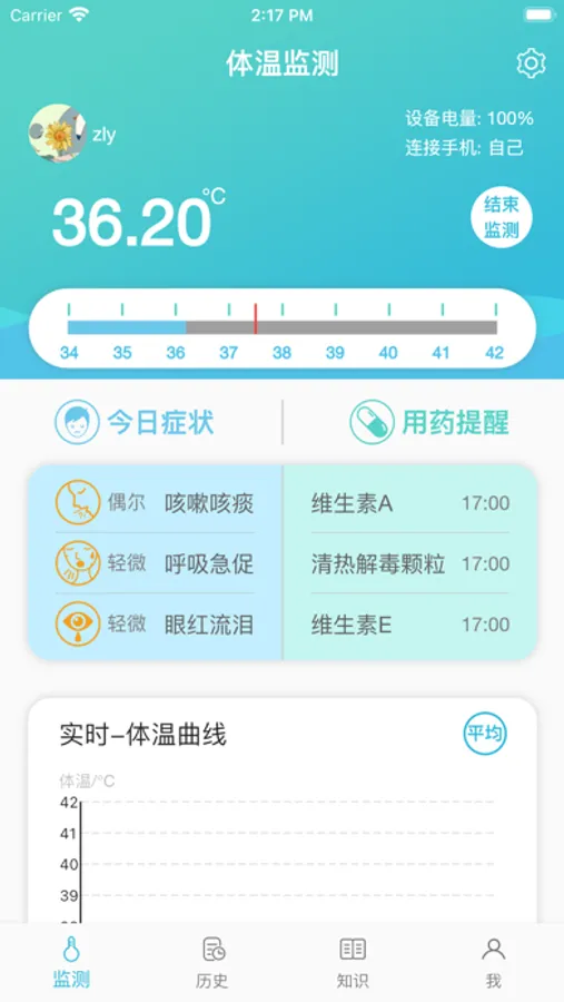 APP定位于需要监控体温的用户,通过蓝牙与电子体温远程监测仪设备连接,进行24小时的腋温监测,并在APP上展示实时温度数据与历史温度曲线。