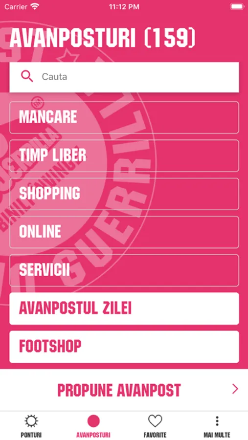 AVANPOST RADIO GUERRILLA este modul în care ne exprimăm respectul pentru orice lucru bine facut, este evaluarea noastra de calitate acordata celor mai buni furnizori de bunuri si servicii din lumea noastra, lumea Radio Guerrilla, lumea celor care-si fac treaba temeinic, cu pasiune si responsabilitate. Poate fi un club, un restaurant, o cafenea, o ceainarie, poate fi atelierul unui cizmar, o brutarie, un magazin cu alimente bio, poate fi o podgorie, o ferma, o firma de decoratiuni, o librărie, poate fi un site, un centru de training sau de limbi straine. Poate fi orice, daca e bine facut il gasesti in aplicatia mobile AVANPOST RADIO GUERRILLA sau pe siteul guerrillaradio.ro/avanpost. AVANPOST RADIO GUERRILLA este selectia noastra de calitate, a tuturor celor care simtim la fel, asadar, te invitam sa propui si tu un Avanpost. Sau mai multe. Validam impreuna propunerile voastre si, daca se califica, devin AVANPOST RADIO GUERRILLA, le listam in aplicatie si pe site. Revenim anual si vedem daca au pastrat standardele.
