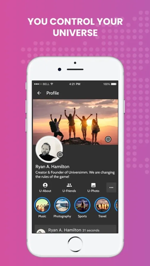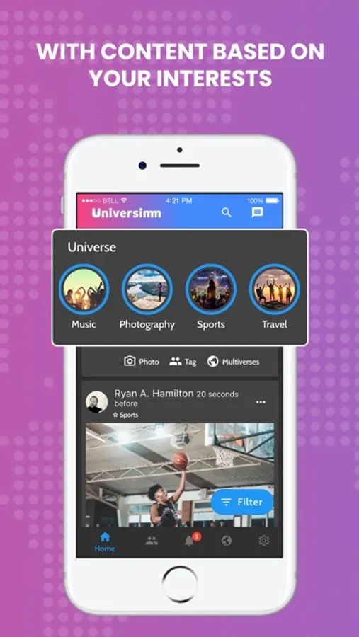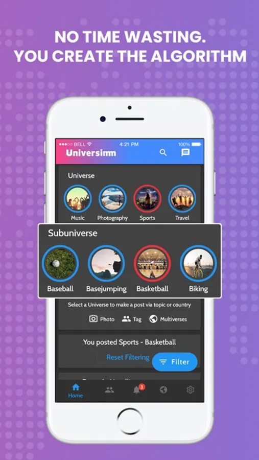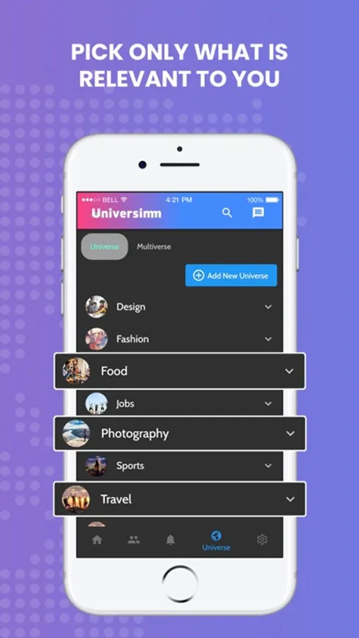 With UNIVERSIMM - you'll experience a refreshing departure from annoying, repetitive and irrelevant ads. Curate content based on your interests, connect with people, who follow the same interests as you and enhance your personal growth through a diverse array of individuals who can inspire and motivate you.