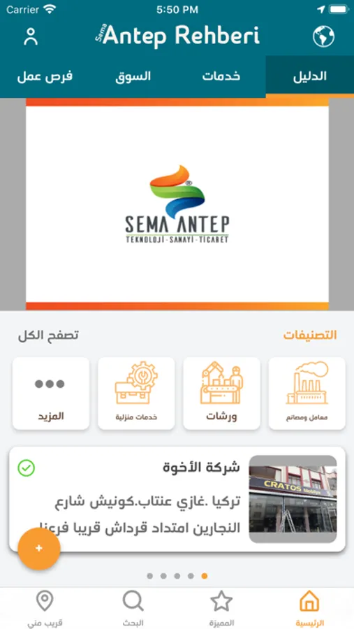 تدعو شركة سما عنتاب جميع الشركات وأصحاب الأعمال والمؤسسات الخاصة والعامة والفعاليات التجارية والخدمية والمدنية والأنشطة المجتمعية العاملة في ولاية غازي عنتاب أو المهتمة بالفعاليات المختلفة في الولاية لأدراج أسمائها وعناوينها وأرقام هواتفها وتفاصيل خدماتها ومنتجاتها في الدليل. حيث لكل شركة أو مؤسسة أو صاحب عمل الحق في أدراج مجاني واحد تحت التصنيف الذي يختاره في القسم التركي أو العربي او الإنجليزي من التطبيق او الموقع. كما وندعوكم لمراسلتنا في قسم المراسلة لبحث سبل التعاون وتطوير العمل المشترك في مختلف القطاعات.