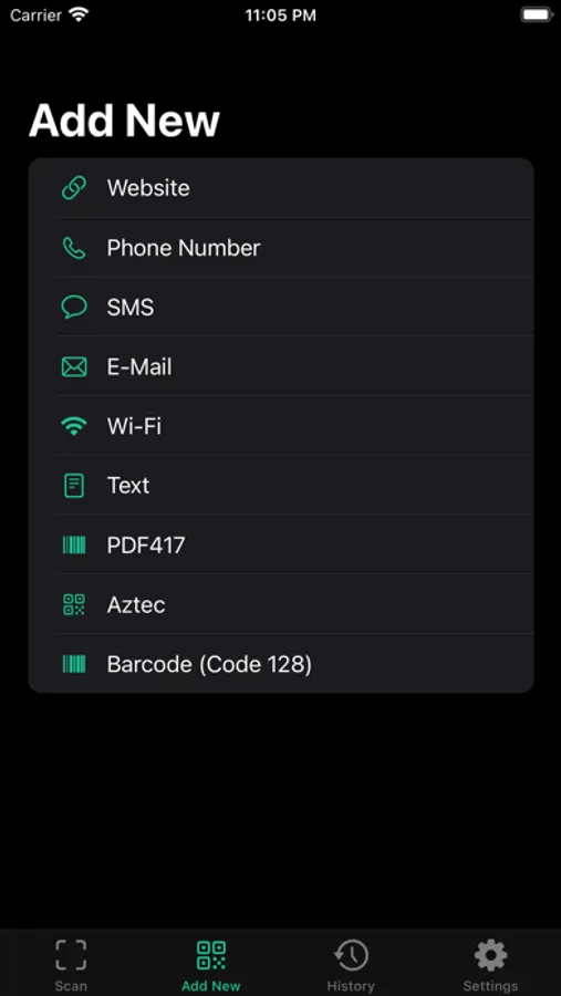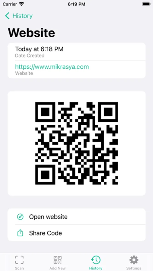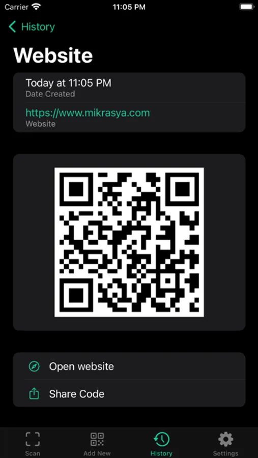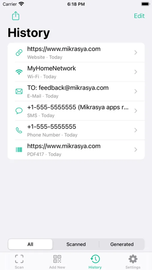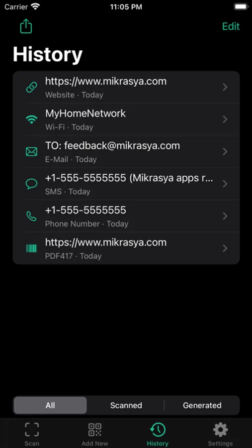 Generate website/URL, e-mail, sms message and phone number QR codes. Share your scanned or generated codes with your friends by tap of a button or export to CSV/Excel.