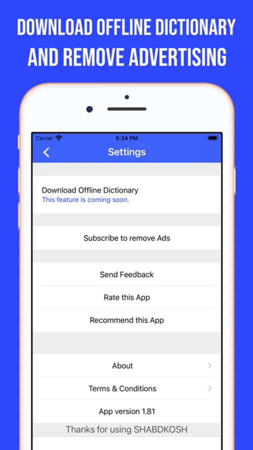 - Offline dictionary (coming soon) downloadable from the Settings screen within the app