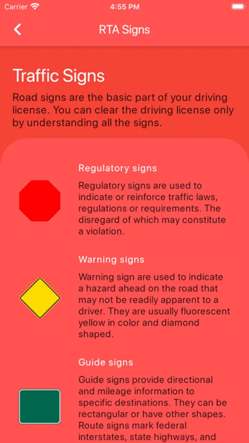 * Road signs are the most important part of DMV driving test so we have provided you with a completely different module for road signs.