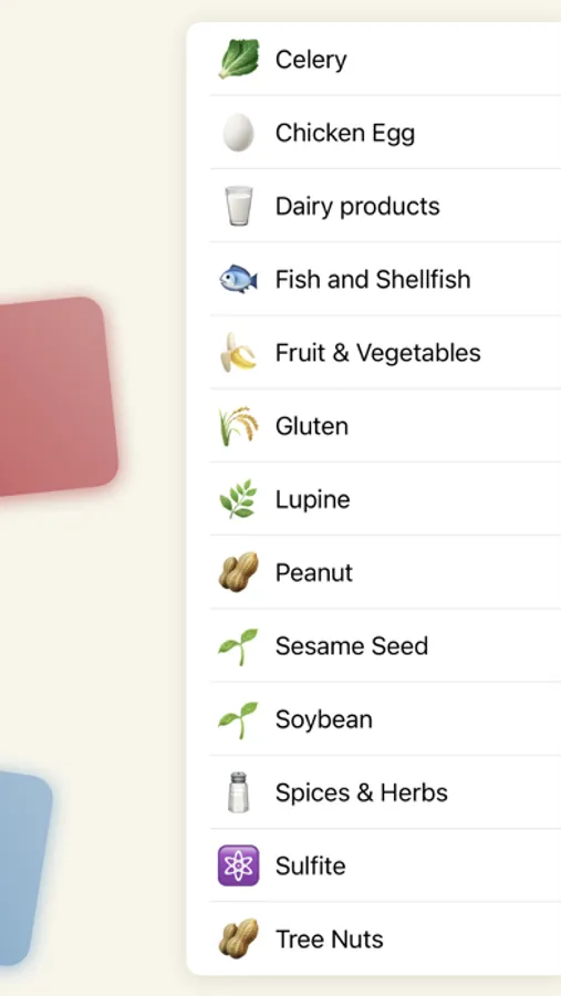 Celery, Chicken Egg, Dairy Products, Fish and Shellfish, Fruit & Vegetables, Gluten, Lupine, Peanut, Sesame Seed, Soybean, Spices & Herbs, Sulfite, Tree Nuts, Animal Derived E-Numbers, General Non-Vegan, Meat, Microplastics, Palm Oil, Sugar, Pregnancy and Additives.