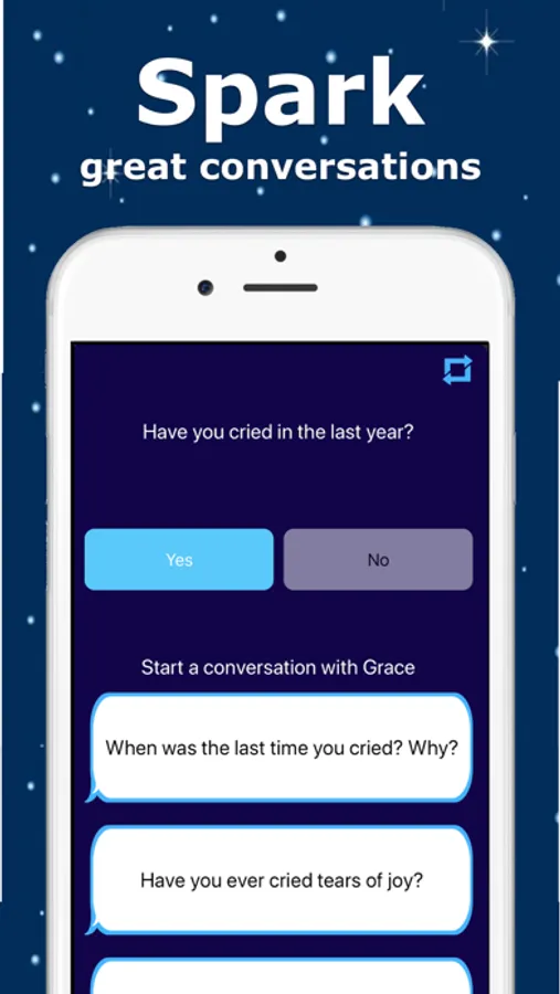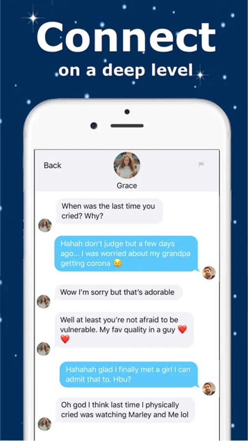 Based on your answers to core personality polls, we generate personalized conversation starters for you and your matches to ask each other. These questions are designed to evoke vulnerability and create an instant emotional bond.