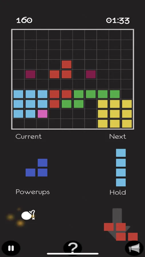 Rotate, Hold and Power-ups. Watch an ad to get more power-ups. Complete a line to win a streak, complete two or more to get double the score. Rotate your pieces before you place them on the grid or put them in Hold for later use. Enjoy the power-ups to quickly move or destroy pieces as you play. Remember, the power-ups appear only when you complete a line or watch an ad (bottom right).