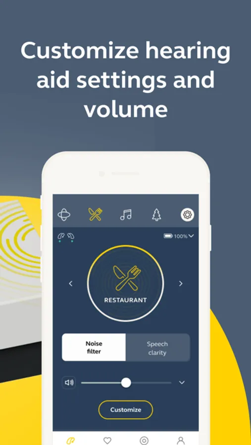 Adjust your volume and sound quality settings such as bass and treble, check your battery status, and tap quick actions like ‘Noise Filter’ on-the-go. At a noisy restaurant or windy park? Switch through 4 programs (All-Around, Restaurant, Outdoor, Music) to instantly cut through noise and optimize the sound for your current environment.