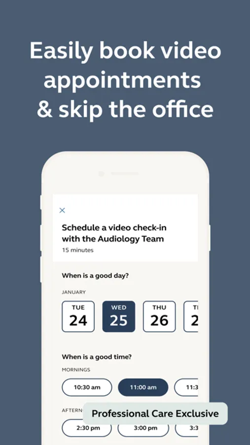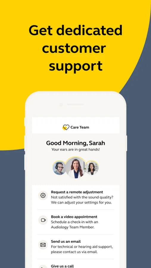 All customers can call our Customer Support Team right from the app for questions, technical support or troubleshooting. Customers who have professional care as part of their Enhance Select package can also connect with our Audiology Team via in-app video appointments, or schedule a follow-up any time.