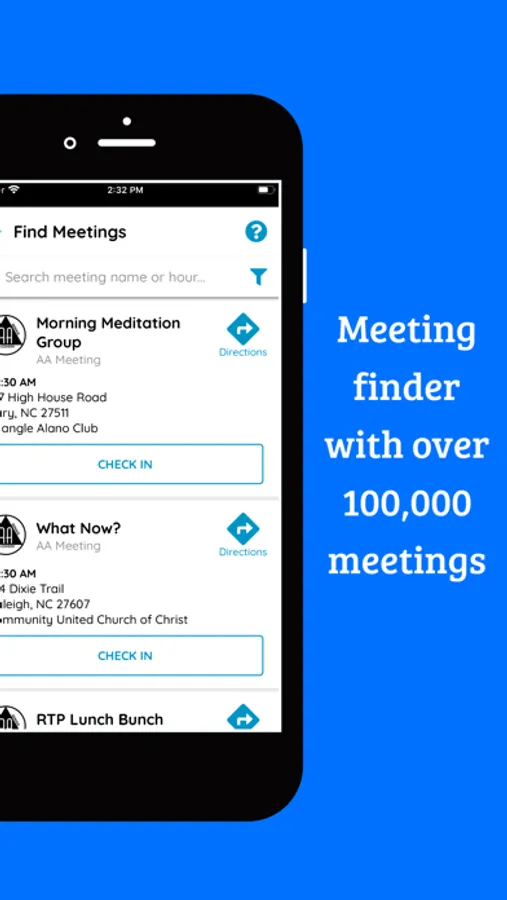 Meetings - meeting lists for the majority of towns and cities in the United States, with the ability for residents to search and check into these meetings via GPS