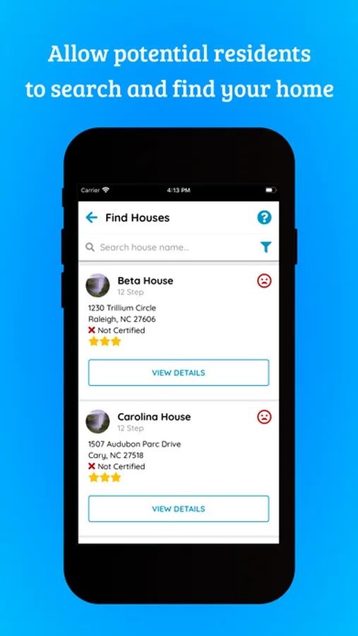 House search - if your home is using this app, it will appear in a house search so other users can find and apply to enter your recovery home if they wish