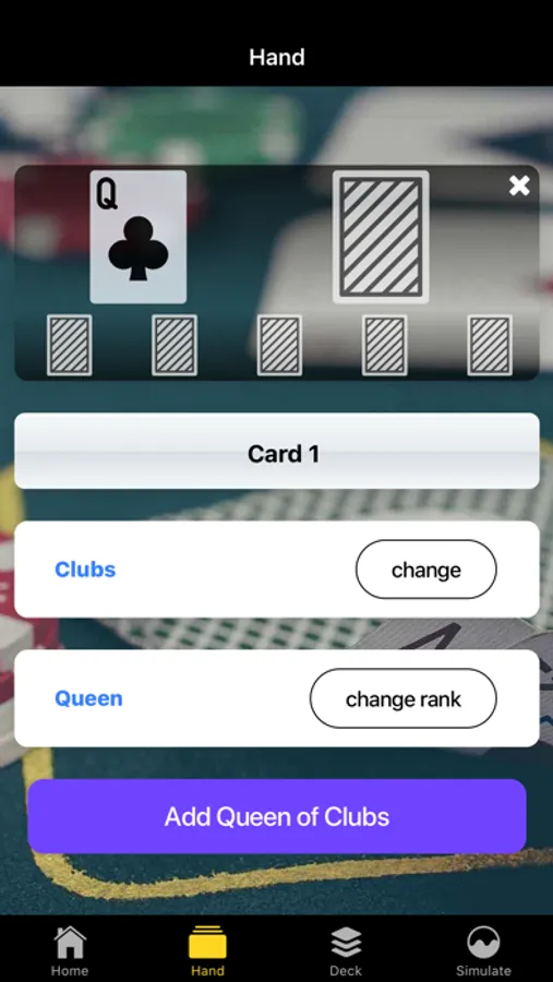It will then run your hand through thousands of simulated games and display your odds of winning. The more cards you select in the simulation, the more accurate it will become.