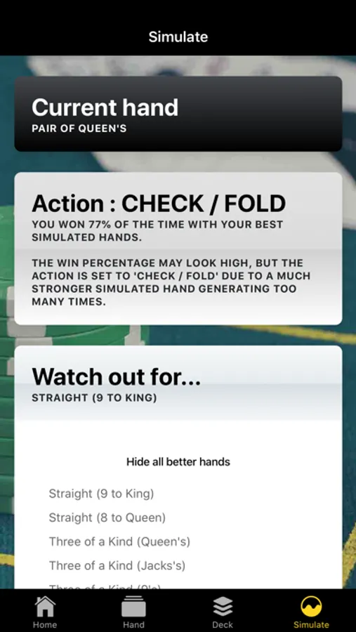 Simulated hands that were stronger than yours will be available to review, so you have a greater chance of assessing what to watch out for in your real game!