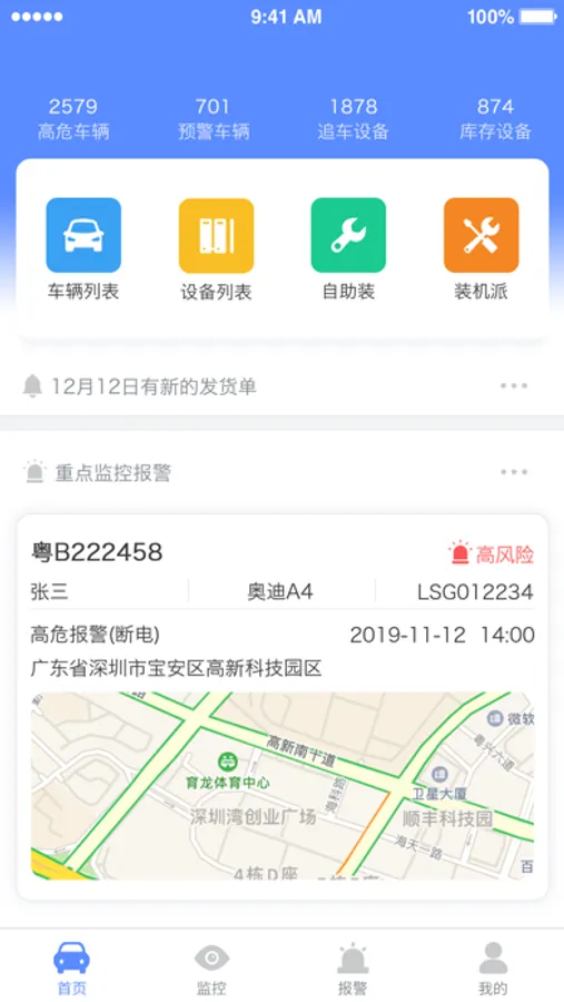 可随时掌握车辆位置、接收预警消息、定位追踪车辆,并提供自助装机和指派装机两种方式,使用更简单便捷。