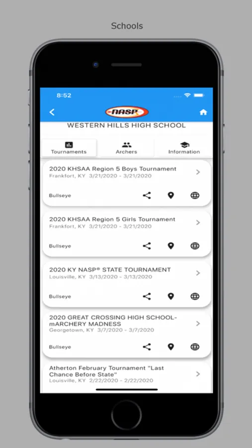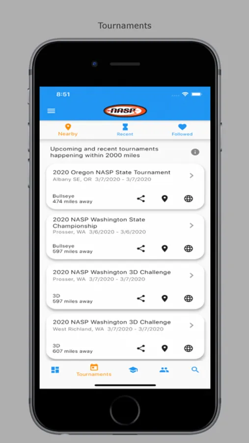 Access NASP® tournament scores, rankings, and event information. Follow schools and archers to keep track of current tournaments and scores. View archer history and analytics for NASP® tournaments.