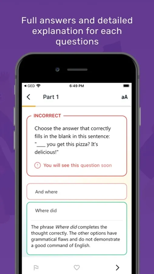 • Mock test: Mock test simulates the real test format. When you finish the test you will see your score and review all the questions.