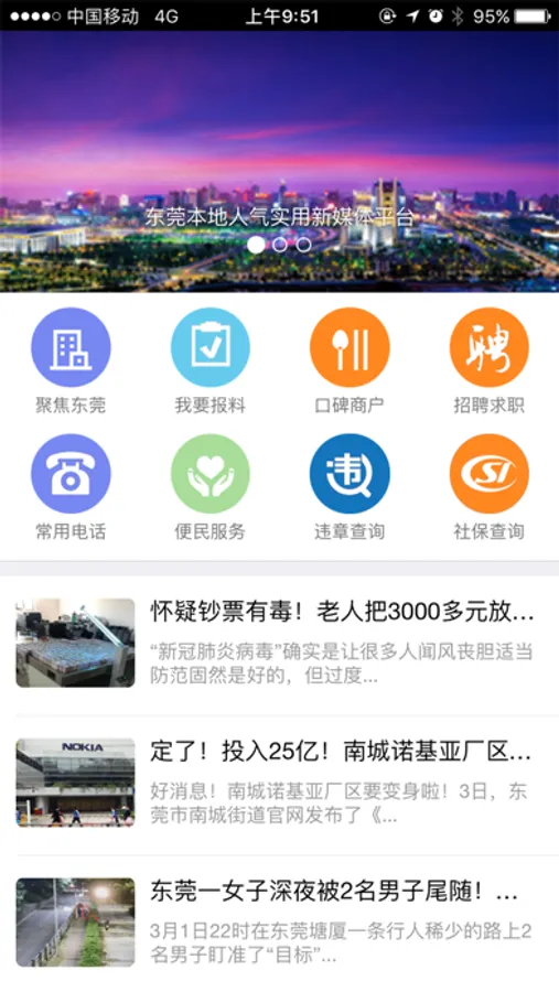掌上东莞是一款简单实用的客户端信息平台,集行业资讯,便民服务功能大全,交通违法查询,供求商机,企业黄页,吃喝玩乐在线查询与预定,一键拨打,地图定位等功能于一体,掌上东莞以其便捷的浏览方式,强大的应用功能,新的资讯信息,为广大客户展示一个丰富多彩的信息平台。