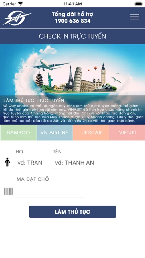+ Hỗ trợ Làm Thủ Tục Trực Tuyến Vietnam Airlines, Vietjet Air, Jetstar, Pacific Air và cả Bamboo Airways nhánh chóng, tiện lợi.