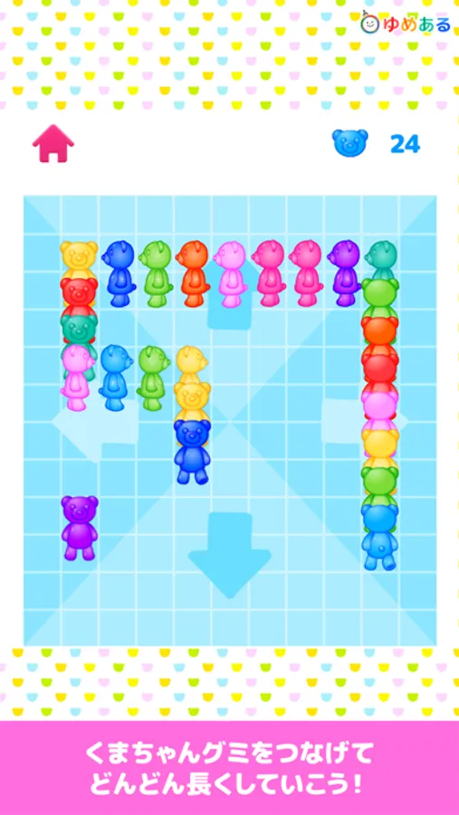 くまちゃんグミは自動で前進するので、画面の上下左右をタップして進行方向を変えてください。