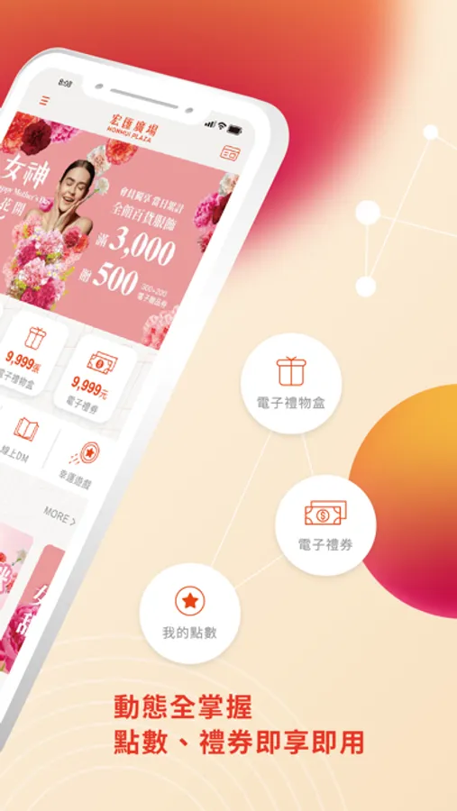 豐富購物生活、最新優惠活動、電子券禮物歸戶、餐廳美食推薦,推播訊息隨時隨地一手掌握。