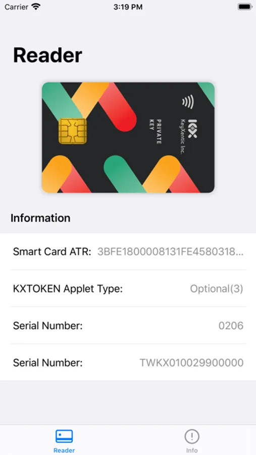 KXCardReader helps user to read the ISO7816 standard contact smart card information through KX906 Smart Token. With supported smart card inserted, more information will be read, such as card information, certificate information and others. KXCardReader automatically detects smart card slot status change and with corresponding operations triggered. User can test with IS7816 standard smart card, such as baking card, credit card or ID card with KXCardReader for basic information.