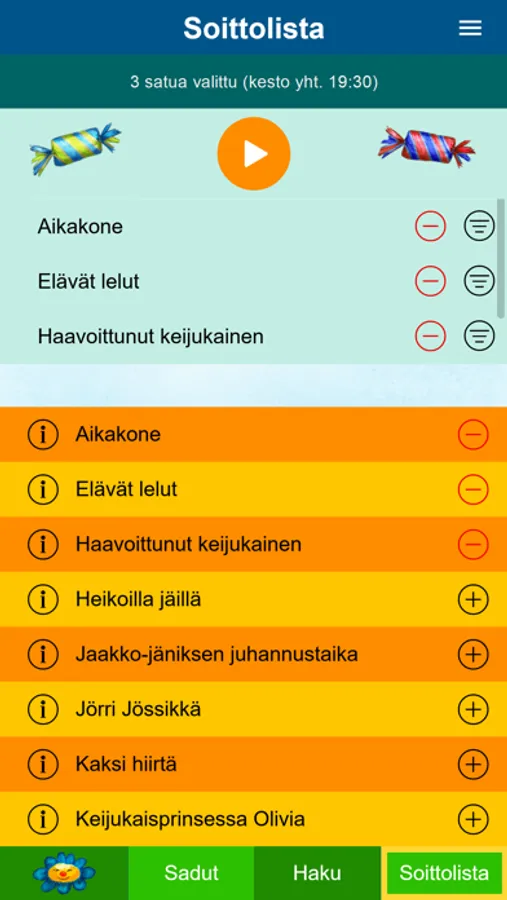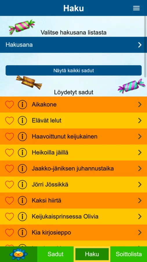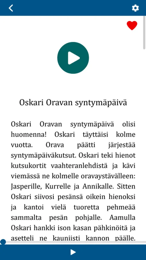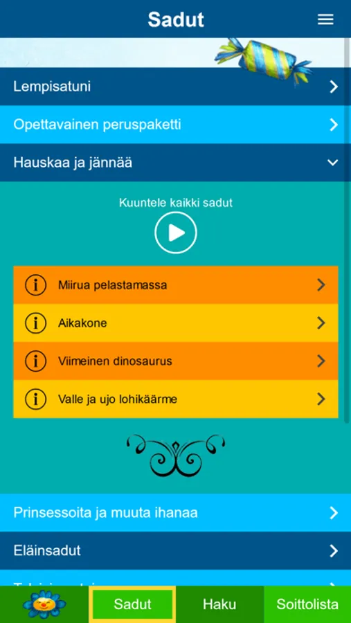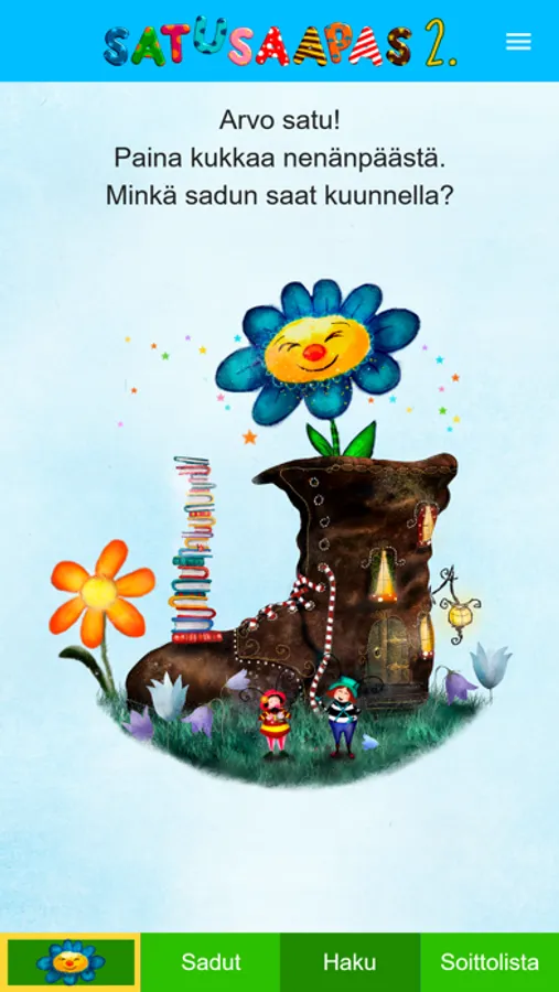 Tämä on Satusaapas 2, joka sisältää 30 satua. Satusaapas-sovellus on helppokäyttöinen lasten satusovellus, jossa voit kuunnella ja lukea satukirjailija Päivi Tuulikki Koskelan kirjoittamia satuja. Sadut lukee muusikko ja ääninäyttelijä Mikko Koskela, joka on myös säveltänyt Satusaappaan tunnusmusiikit. Satumaiset grafiikat ovat taiteilija Petronella Grahnin käsialaa. Sovelluksessa voit hakea satuja aiheen tai opetuksen mukaan, tehdä soittolistoja ja valita lempisatuja. Tai jos et osaa valita, paina vain kukkaa nenänpäästä ja se arpoo sinulle sadun kuunneltavaksi. Minkähän sadun sinä saisit kuunnella? Onko siinä nalle, dinosaurus tai ehkäpä orava, jolla on syntymäpäivä?