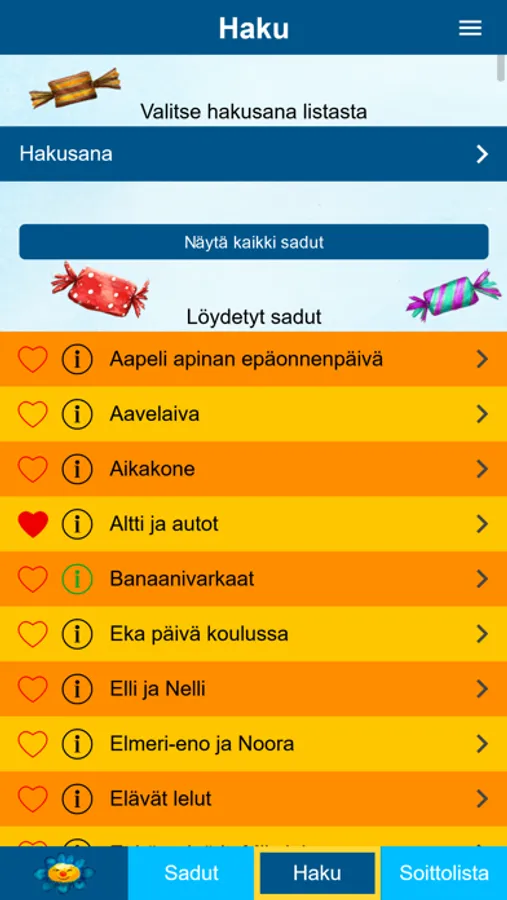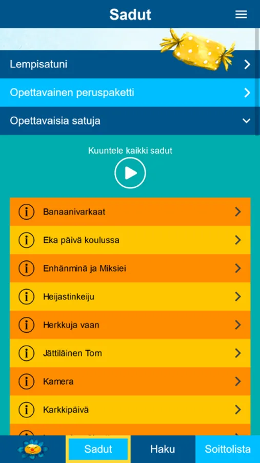 Sovelluksessa voit hakea satuja aiheen tai opetuksen mukaan, tehdä soittolistoja ja valita lempisatuja. Tai jos et osaa valita, paina vain kukkaa nenänpäästä ja se arpoo sinulle sadun kuunneltavaksi. Minkähän sadun sinä saisit kuunnella? Onko siinä hiiriä, avaruusolioita tai ehkäpä ujo lohikäärme?
