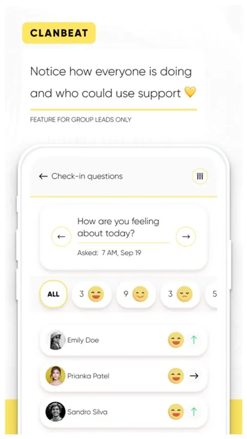 * Well-being support with: automated check-in questions, actionable data reports, mood statistics, and red flags.