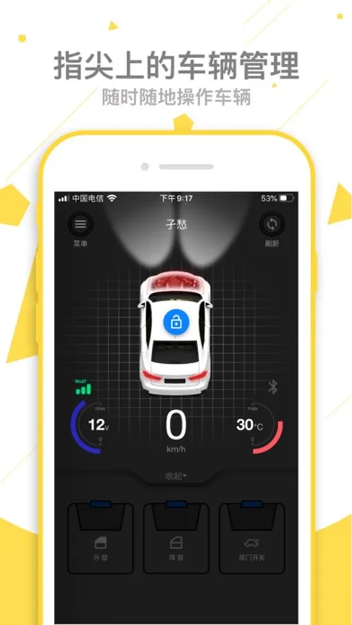 5、状态:显示实时的车辆行驶速度,车辆所在位置,车辆的设防、撤防状态,车辆启动状态,车门开关状态,还有各类报警提示内容。