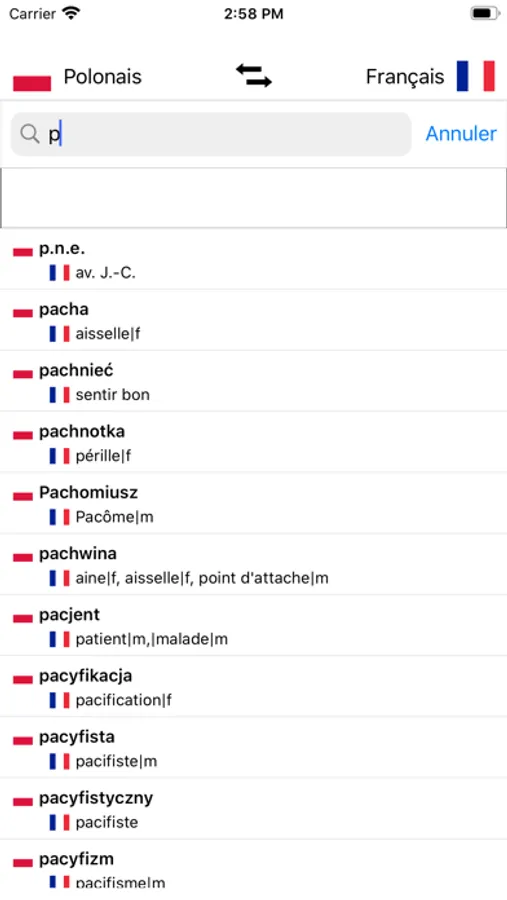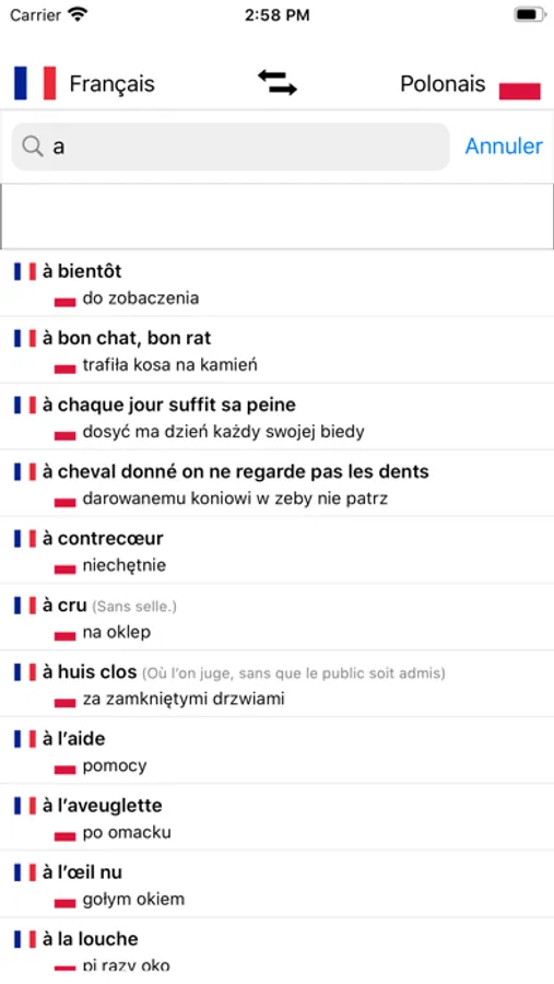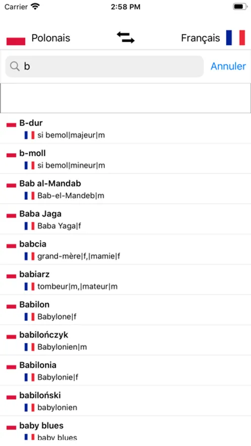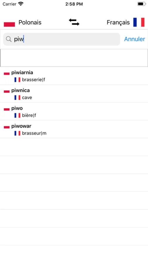 - Recherche à partir des mots en français et à partir des mots en polonais