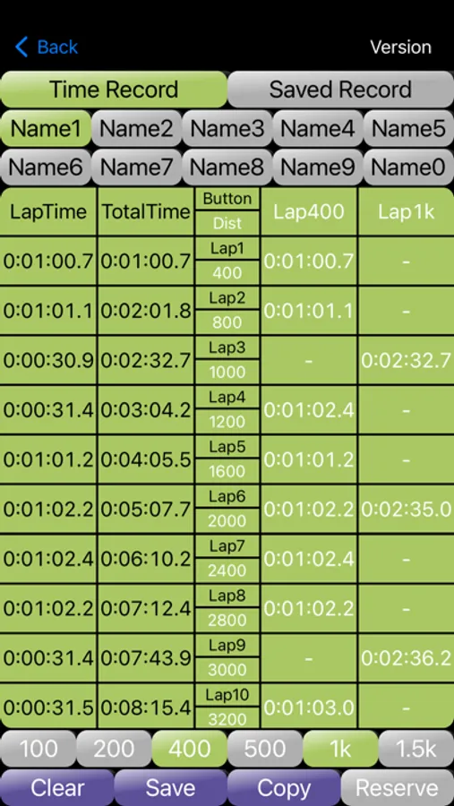 By selecting the unit distance for lap timing, the lap time for each unit distance is displayed.