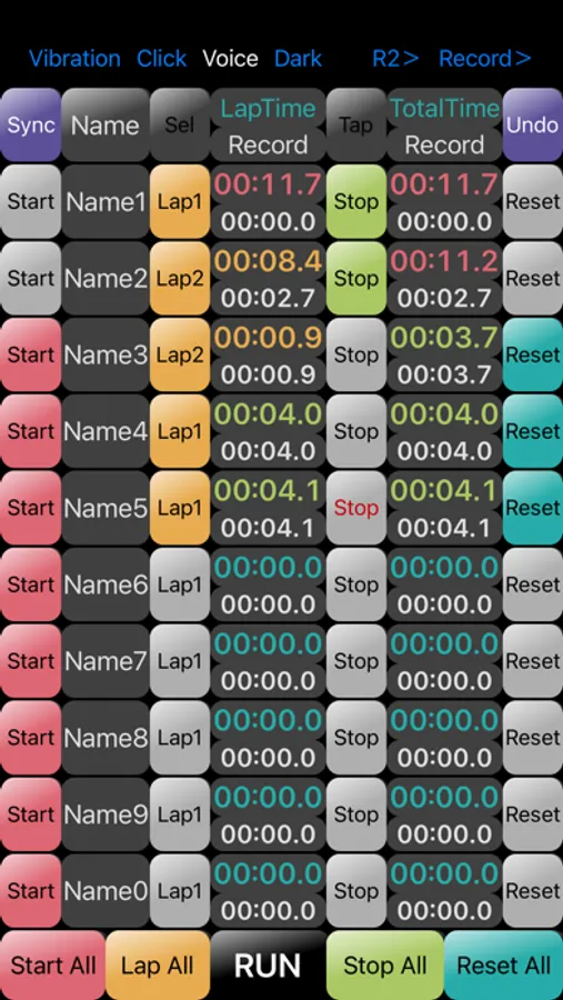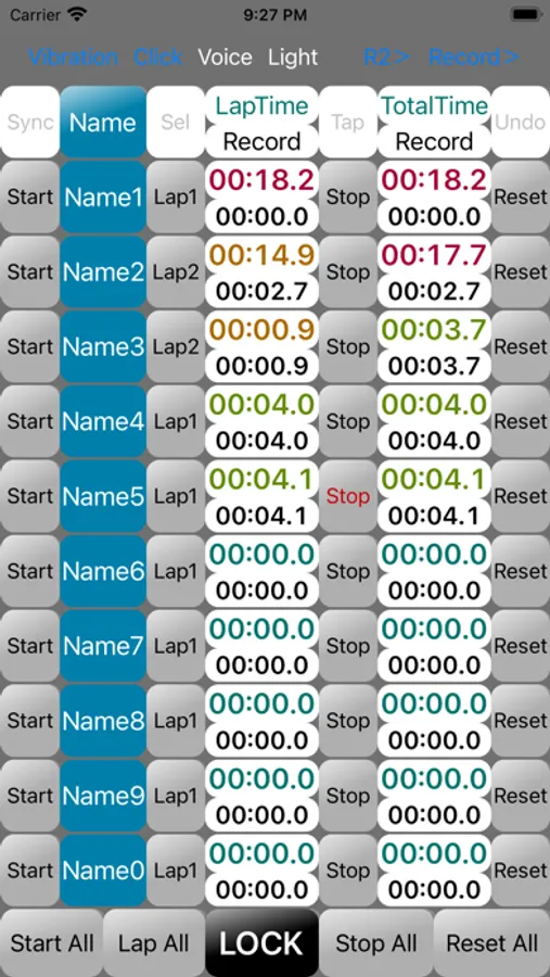Lap time and total time are displayed repeatedly in the range from 00:00.0 to 59:99.9.